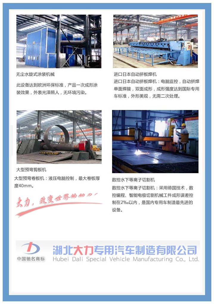 公司擁有無塵旋式涂裝設(shè)備、數(shù)控水下等離子切割機(jī)、大型預(yù)彎卷板機(jī)、大型加長卷板機(jī)、日本自動(dòng)拼板焊機(jī)、自動(dòng)埋弧焊機(jī)等國內(nèi)外先進(jìn)設(shè)備,同時(shí)引進(jìn)國內(nèi)外先進(jìn)技術(shù)和生產(chǎn)工藝,這些設(shè)備和技術(shù)的引進(jìn),促進(jìn)了公司專用車制造水平、產(chǎn)品質(zhì)量的提高。