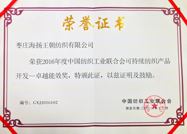 2016年12月12日中國紡織工業(yè)聯(lián)合會在北京召開了2016中國紡織創(chuàng)新年會,公司總經(jīng)理孫勇受邀參會。在此次大會,我公司被授予“2016年度中國紡織工業(yè)聯(lián)合會可持續(xù)紡織產品開發(fā)-卓越能效獎”榮譽證書,充分肯定了我公司多年來在能源利用和節(jié)能方面取得的成績,這也堅定了公司走科技含量高、經(jīng)濟效益好、資源消耗低、環(huán)境污染少的新型工業(yè)化道路的決心,努力將海揚王朝打造成國際知名的現(xiàn)代化紡織企業(yè)!