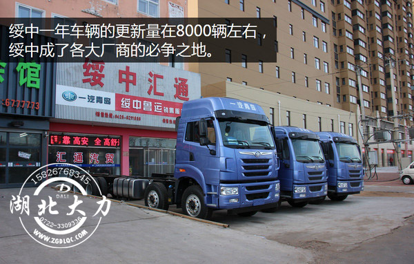 綏中一年車輛的更新量在8000輛左右,綏中成了各大廠商的必爭(zhēng)之地,在綏中各個(gè)品牌的卡車經(jīng)銷商基本都能看見(jiàn)。其中解放的在當(dāng)?shù)氐谋S辛磕苓_(dá)到80%,當(dāng)?shù)貙?duì)于解放的品質(zhì)還是比較認(rèn)可,在綏中的大街上J6隨處可見(jiàn),而且以領(lǐng)航版居多。