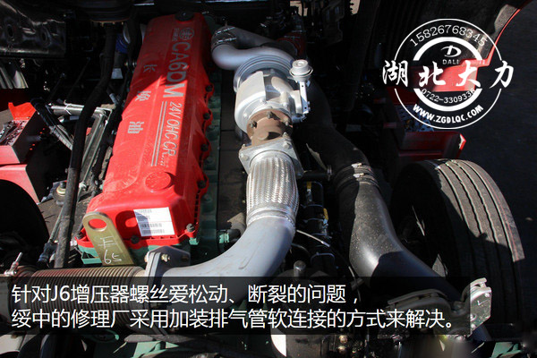 綏中以散戶車輛為主,在提車之后都會(huì)根據(jù)自己的使用需要進(jìn)行相應(yīng)的改裝。針對(duì)J6增壓器螺絲愛(ài)松動(dòng)的問(wèn)題,綏中的修理廠采取排氣管軟連接的方式來(lái)緩解震動(dòng),改裝后,增壓器螺絲松動(dòng)甚至斷裂的情況基本杜絕。像加裝變速箱吊架,加裝尿素保護(hù)罩,電瓶防護(hù)架等在當(dāng)?shù)匾残纬闪烁难b特色。