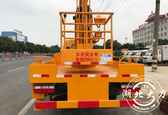東風大多利卡空作業(yè)車依客戶要求可定制18米三節(jié)折疊式作業(yè)臂,大力高空作業(yè)車采用前后H型四液壓支腿,轉臺、工作斗雙工位操作雙工位操作,可360°旋轉、工作斗額定載質量200公斤,配置1噸吊鉤,貨箱式平臺。