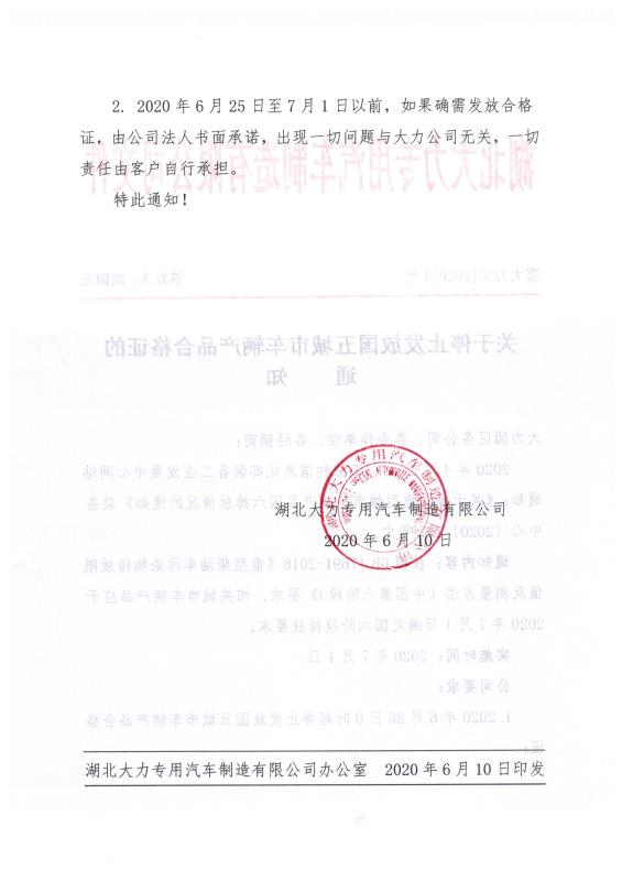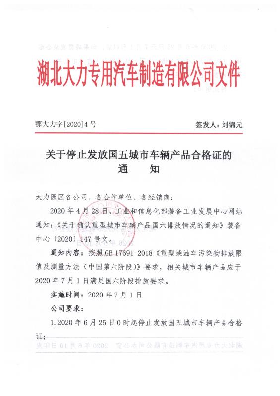 2020年4月29日工業(yè)和信息化部裝備工業(yè)發(fā)展中心下發(fā)的【2020】147號文件關(guān)于確認(rèn)重型城市車輛產(chǎn)品國六排放情況的通知,根據(jù)實際情況湖北大力專用汽車制造有限公司下發(fā)關(guān)于停止發(fā)放國五城市車輛產(chǎn)品合格證的通知。