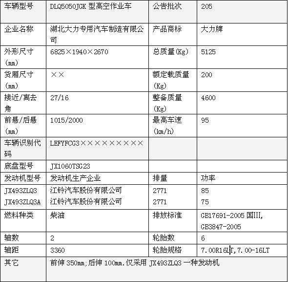 下列是湖北大力專用汽車有限公司江鈴14米高空作業(yè)車主要技術參數(shù)及性能: