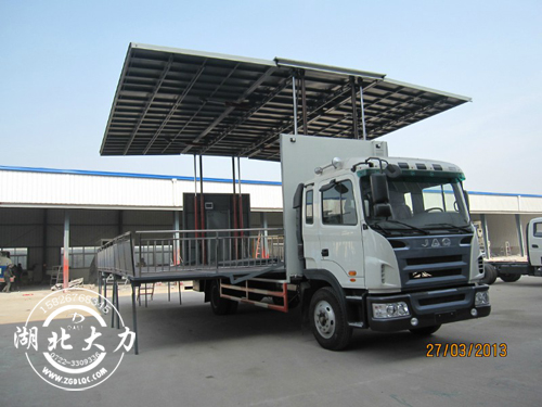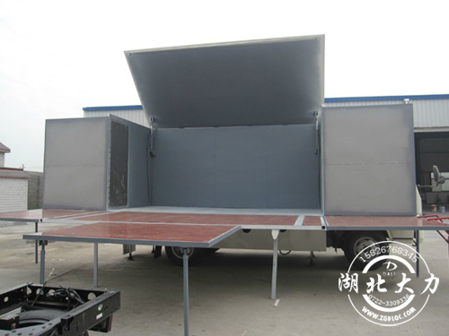專用裝置:折疊式平臺、支腿、頂棚 ;專用功能:作業(yè)時其外側(cè)板和頂板可向上展開升高,內(nèi)側(cè)板向下展開平鋪后, 可形成舞臺的地板。該車是進(jìn)行舞臺文藝表演的專用車輛。選裝車門覆蓋件,前圍及前部燈具.選裝前圍及前部燈具,選裝車門覆蓋件,選裝保險杠,因選裝保險杠引起前懸加長45。側(cè)防護(hù)采用冷彎型鋼/Q235-A,螺栓連接,后防護(hù)采用冷彎型鋼/Q235-A,焊接連接。后防護(hù)截面高度尺寸100mm, 截面寬度尺寸50mm,下邊緣離地高度400mm。