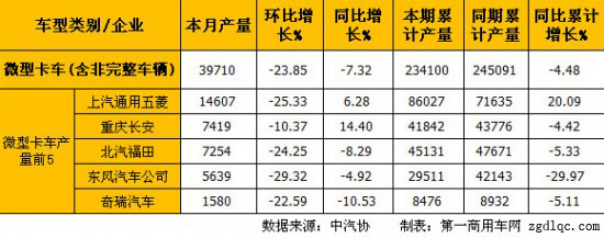 6月份微型卡車(含非完整車輛)產(chǎn)量前5的企業(yè)依次為:上汽通用五菱(14077輛)、北汽福田(6967輛)、重慶長(zhǎng)安(6960輛)、、東風(fēng)汽車公司(5814輛)和奇瑞汽車(1138輛),5家合計(jì)生產(chǎn)34956輛,占微型卡車(含非完整車輛)總產(chǎn)量36823輛的94.93%。