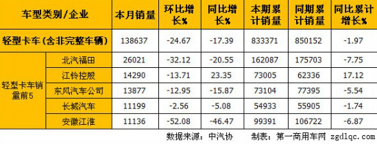 6月份輕型卡車(含非完整車輛)銷量前5的企業(yè)依次為:北汽福田(15841輛)、東風(fēng)汽車公司(14365輛)、安徽江淮(13853輛)、江鈴控股(11938輛)和長(zhǎng)城汽車(10188輛),5家合計(jì)銷售66185輛,占輕型卡車(含非完整車輛)總銷量109764輛的60.30%。