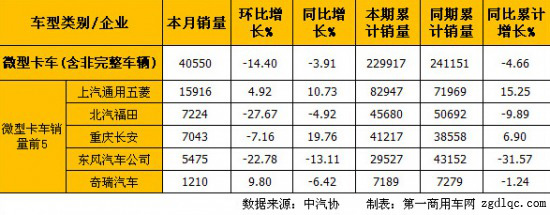 6月份微型卡車(含非完整車輛)銷量前5的企業(yè)依次為:上汽通用五菱(16259輛)、重慶長(zhǎng)安(6895輛)、北汽福田(6466輛)、東風(fēng)汽車公司(5880輛)和奇瑞汽車(1178輛),5家合計(jì)銷售36678輛,占微型卡車(含非完整車輛)總銷量38919輛的94.24%。