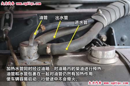 水加熱探管采用發(fā)動(dòng)機(jī)循環(huán)水的溫度來加熱油箱內(nèi)柴油,類似給油箱內(nèi)加裝了“暖氣片”。詳細(xì)改裝過程請(qǐng)點(diǎn)擊《柴油加熱器》一帖。這類改裝能夠保證安全性,加熱穩(wěn)定,配合加裝柴油鍋爐,將使車輛順利完成冷啟動(dòng)過程。