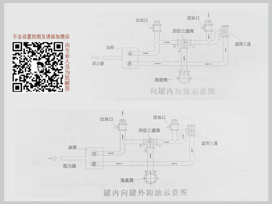 ②當(dāng)你要排油(泵出油)時(shí),油罐車油路是這樣走的:油罐車海底閥→ 四位三通球閥A-C→ 濾網(wǎng)三通→ 進(jìn)入油泵→ 出油泵→ 到出油口→ 出油了。這條油路中以經(jīng)過的環(huán)節(jié),閥門打開,其它閥門關(guān)閉。