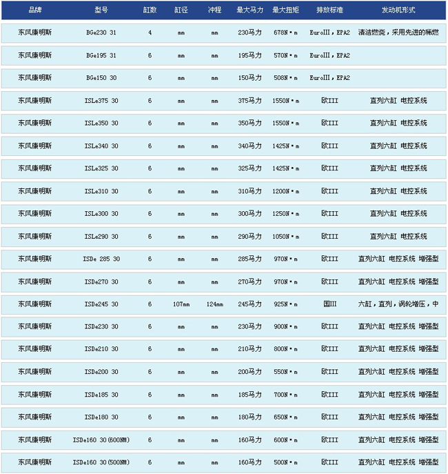 東風(fēng)康明斯發(fā)動機(jī)部分型號圖表